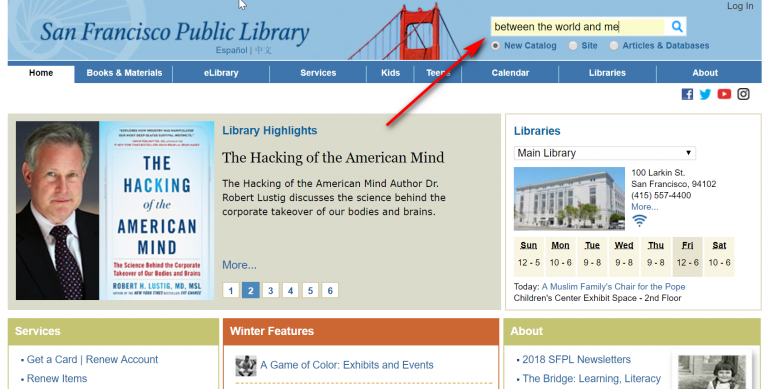 Do a search for your local library’s website. The address may be different. For the San Francisco library, go to https://sfpl.org. You can then search for a book. For example, I searched for Between the World and Me (which is a GREAT book, by the way).