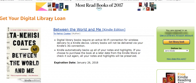 Log in again and you’ll see the book listing, and a button to “Get library book.” Be sure to select the device you want to send it to. Connect the device to the internet, either the Kindle or Kindle app and you should see the book appear. That’s it. Easy peasy lemon squeezy.